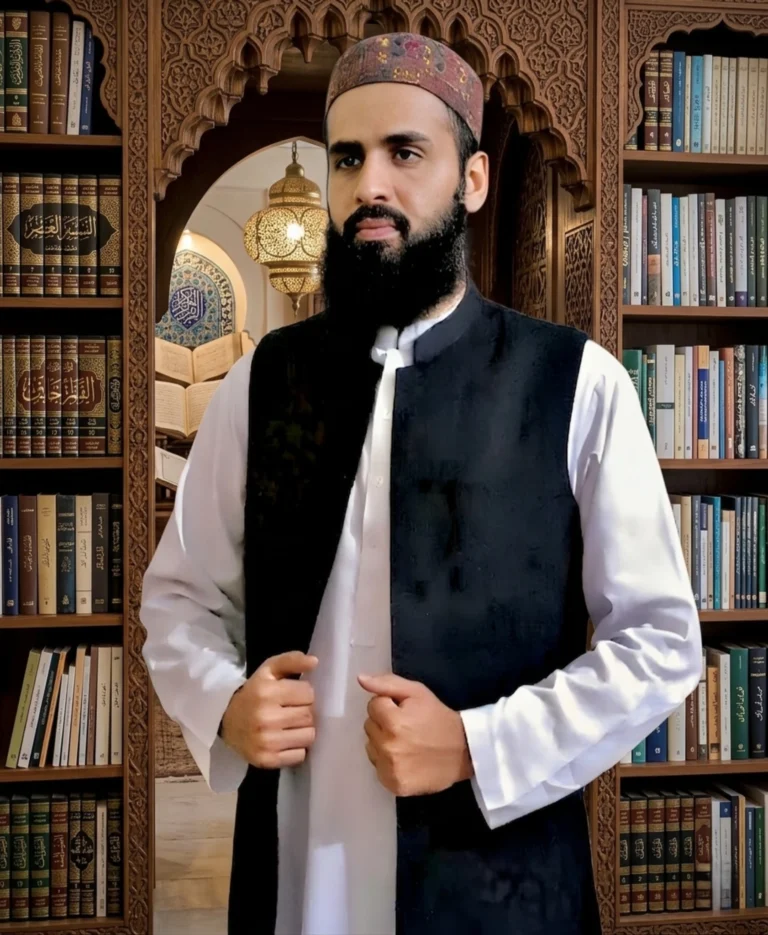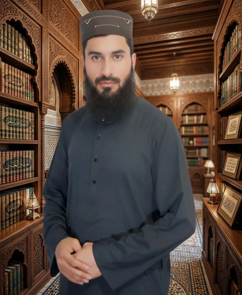 Sadiq-ur-Rehman Ijazah certified Quran tutor in traditional attire standing in library with Islamic books